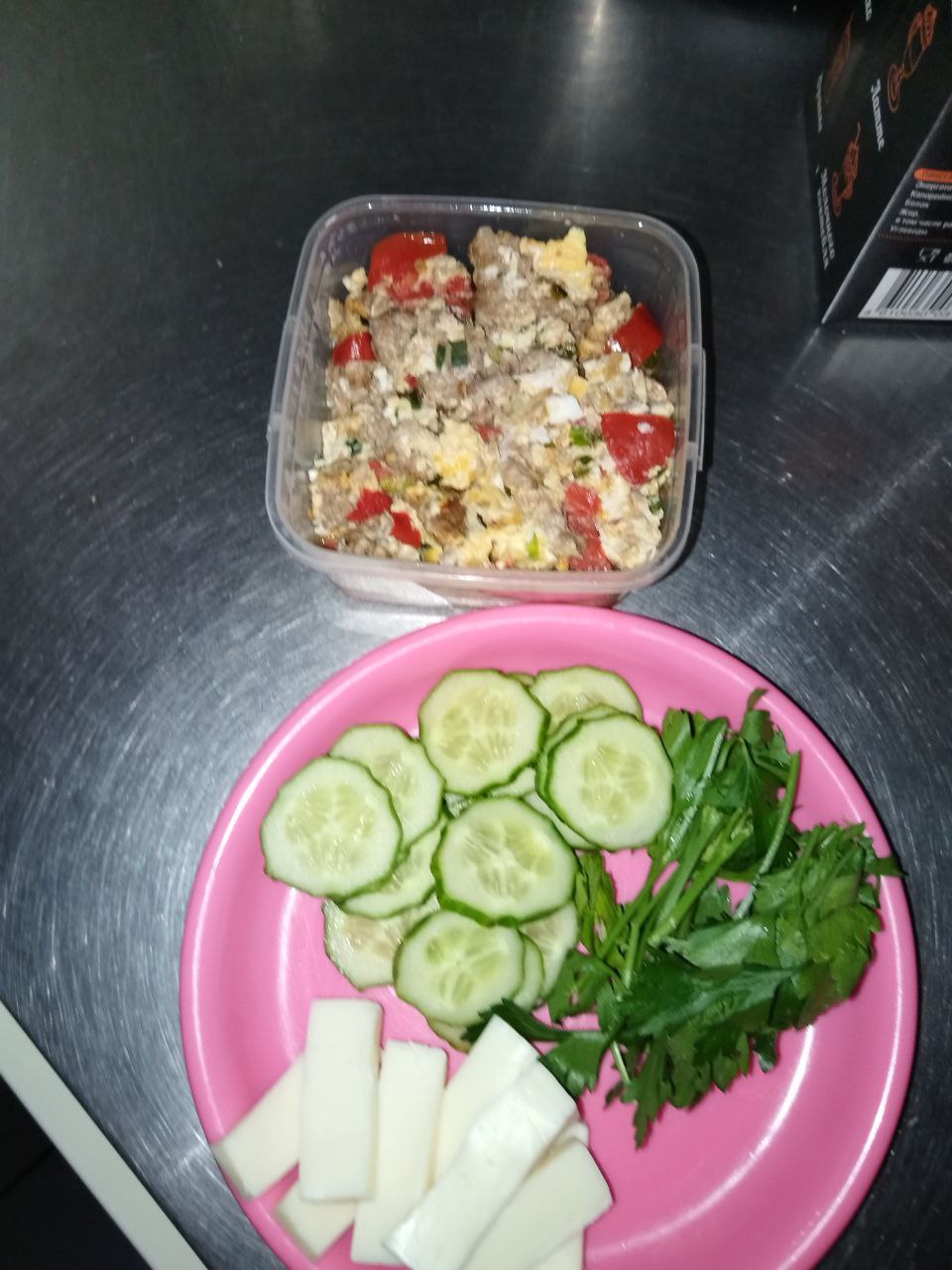 1 прием пищи:свиной фарш, поджаренный на жиру с зелёным луком, и помидорами. Огурец, петрушка, моцарелла грамм 100, наверное.