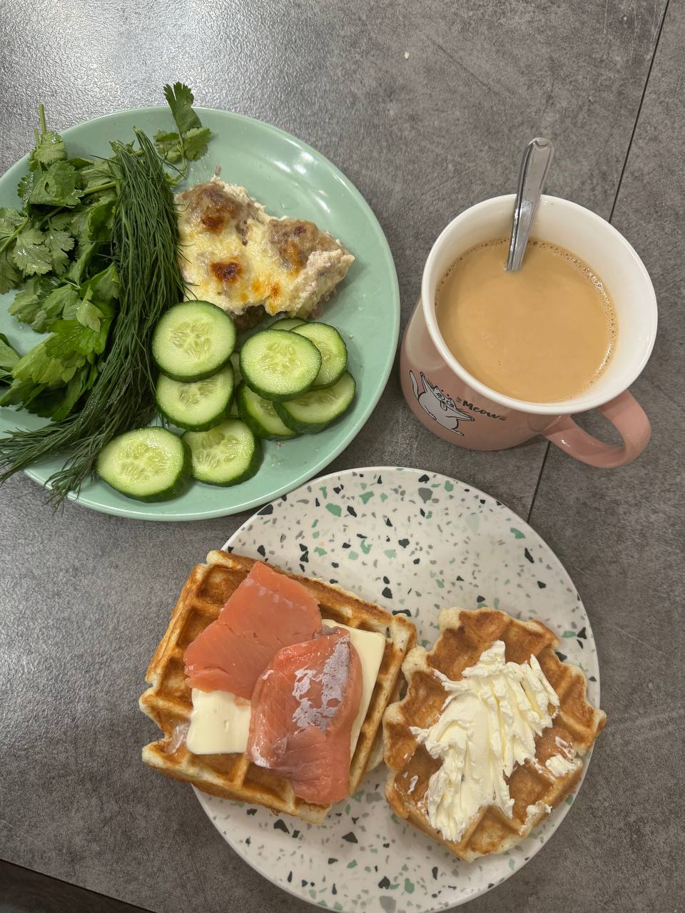 Завтрак - тефтели по рецепту, кетовафли со смальцем, форелью, и с маскарпоне (одна такая, вторая другая), кофе со сливками 33%.