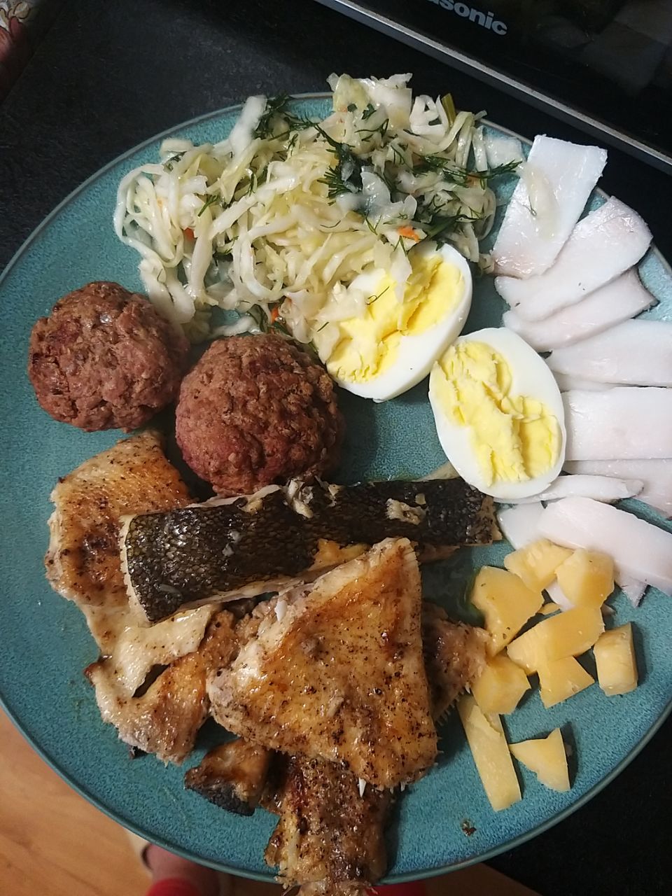Добрый вечер💞🤗 Камбала на гхи, котлеты свинина/говядина, салат ( авокадо, укроп, кинза, оливковое масло, семечки, дрожжи), сало, пармезан, яйцо, квашеная капуста с укропом и оливковым маслом. Яу с минералкой, калий.Была люто голодная, думала съем все сразу, а на вечер еще приготовлю🙈 В итоге ровно половину съела. Вторая равноценная половина на ужин. То есть это на два раза. Потом еще на ночь магний. С утра пила шрот. А еще я все утро, пока собиралась на работу, слушала через колонку Ваши голосовые ответы, все подряд, вместо музыки. Очень круто, не напряжно, усваивается много информации👍 Спасибо💗