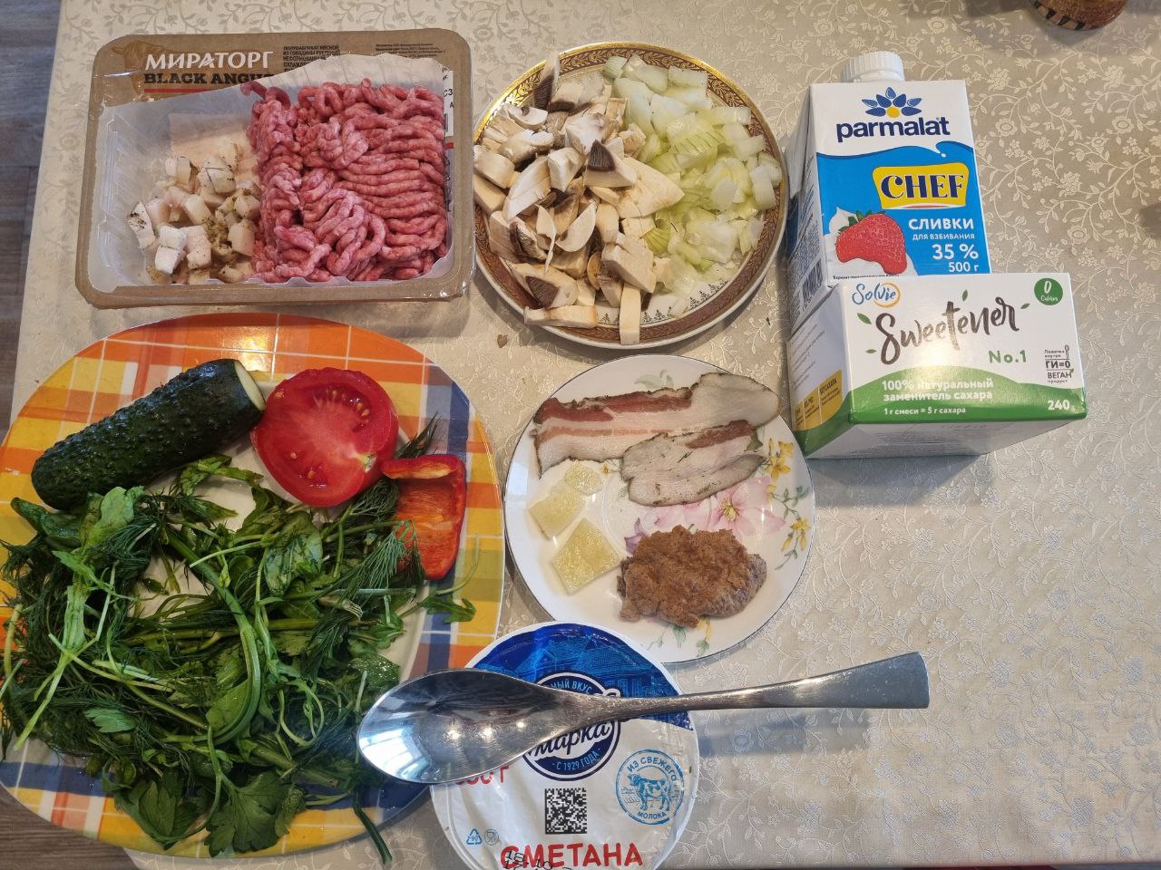Сверху завтрак: фарш жирный говяжий, жареный на сале с луком и грибами (порция на фото - на 2 приема), салат со сметаной 25%, миндальный хлеб + сало + кусочек сыра. На десерт взбитые сливки и подсластителем.