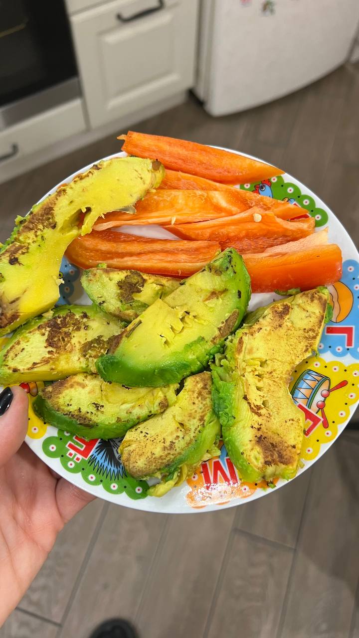 Тефтеля из мяса птицы под сливками по рецепту, омлет на подушке, руккола, перец, жаренный авокадо 1/2