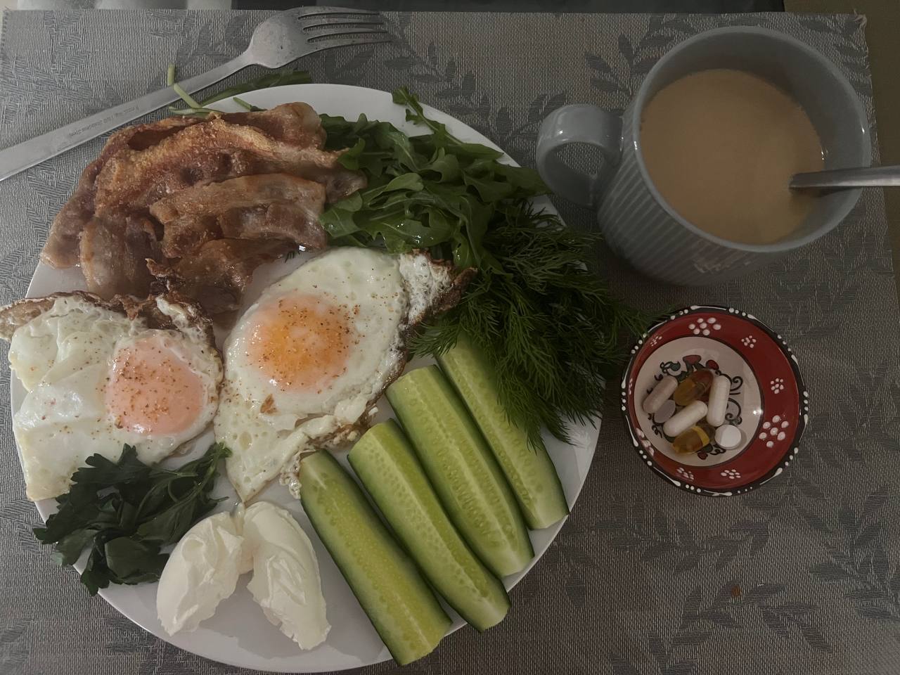 Завтрак - жареный бекон, два яйца жареных на жире от бекона, огурец, зелень, две ложечки маскарпоне, кофе со сливками и сахзамом.