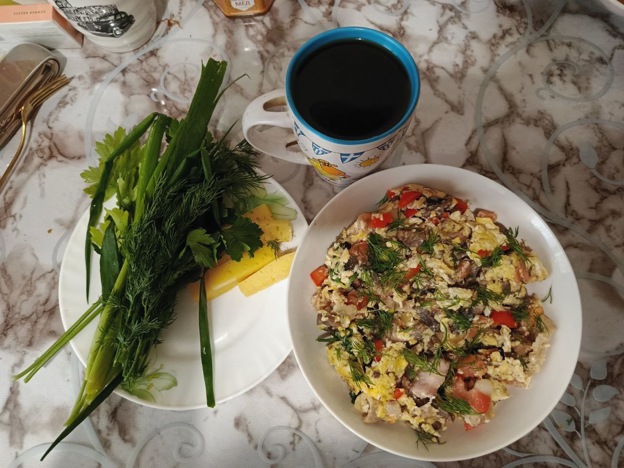 Омлет , на кокосовом масле для жарки, копченой грудинки домашнего копчения, бекон, немного перца болгарского, помидорки черри, 1 шампиньон., соль. Кофе просто черный молотый, без сахзама. Твердый сыр.