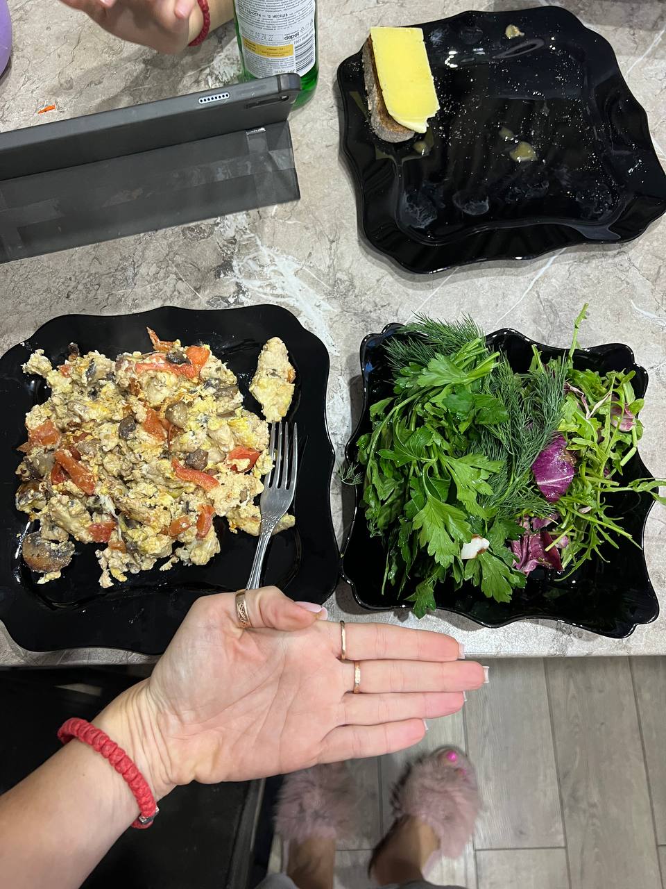 ОМАД. 250 мл супа пюре с кобачком сельдерей грибы и сливки 33 % на курином бульоне. И 3 яйца с курино-свином фаршем и грибами, 1/2 помидора жареные на сливочном масле, зелень.