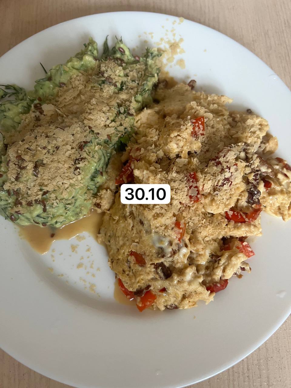 Обжарила бекон 5 полосок нарезанных, выделился жир и добавила паприку, три яйца со сливками 33%, моцареллу. Зеленое слева - авокадо (дозревший) с творожным сыром, семенами, зеленью (петрушка, укроп), слив маслом и всё это заправлено оливковым маслом. Руккола за кадром. Все посыпала солью и дрожжами.