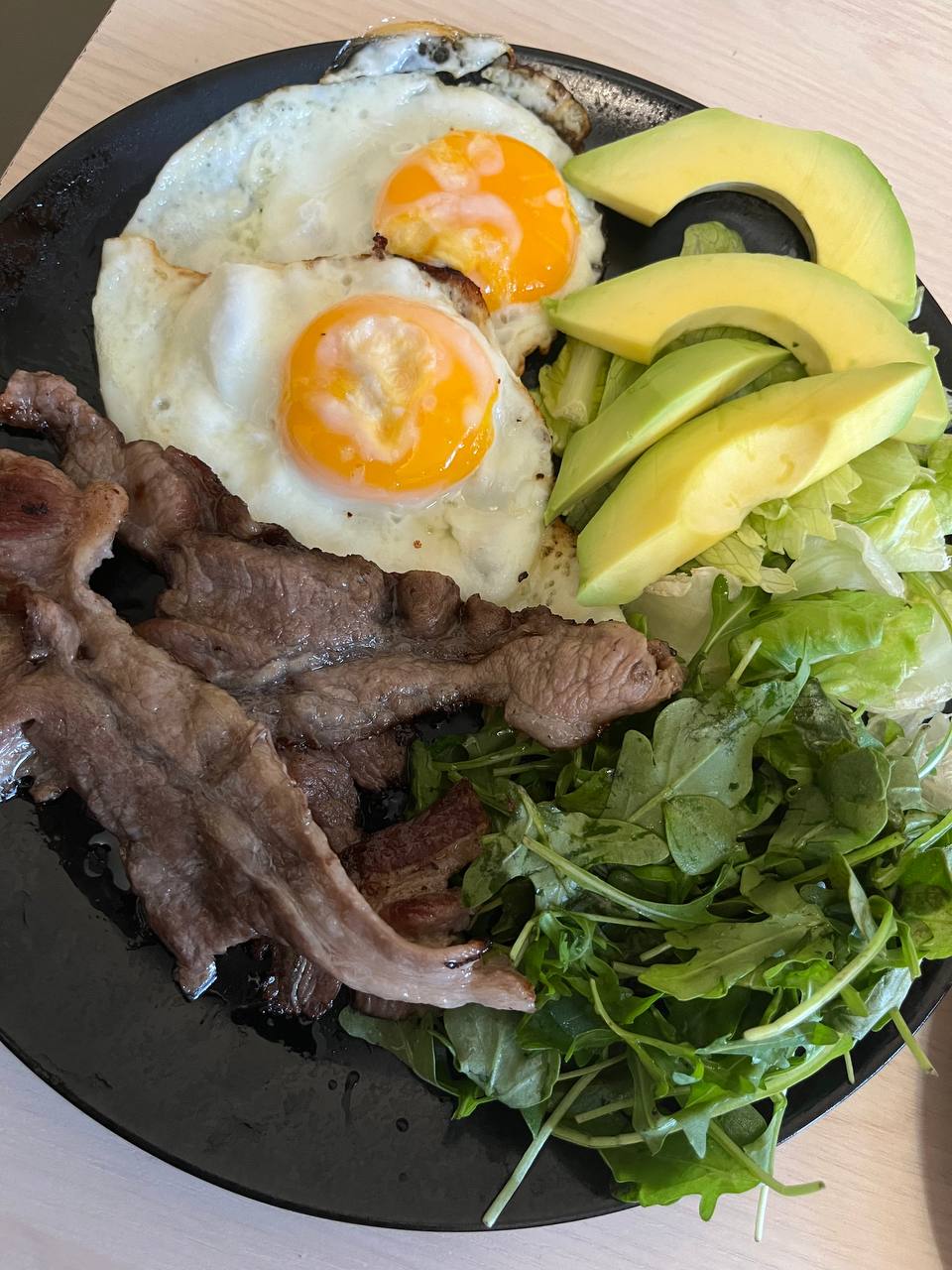 2 жареных яйца на сливочном масле и бекон 3 полосочки