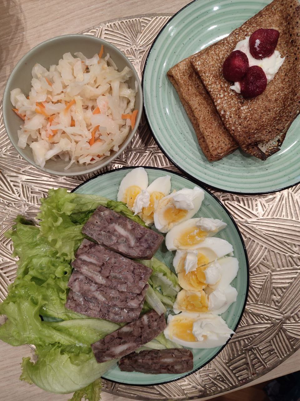 2 яйца, печень по домашнему (магнит), квашеная капуста , чуть зеленухи не темной + витграс , два блина по рецепту Ольги 👍
