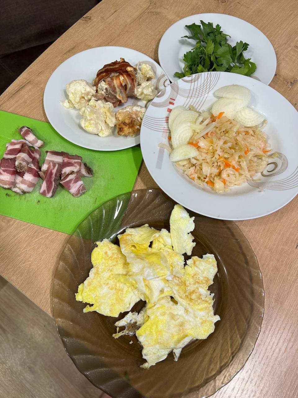 3 яйца на сливочном масле, сало, квашенная капуста домашняя с оливковым маслом,петрушка и остатки от вчерашнего приема пищи( грибы в беконе и цветная капуста в сливках)