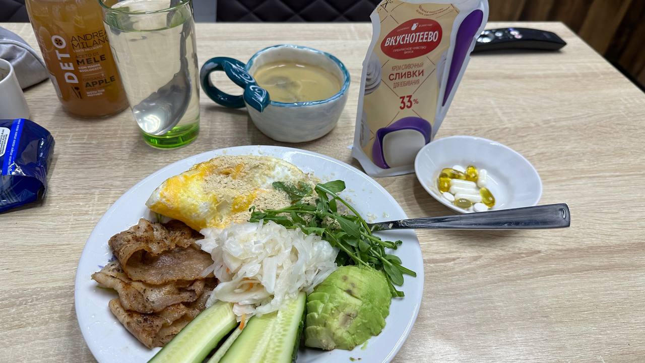 1пп 9:15 - растоптыши с минералкой, 2 яйца на сливочном, 3 полоски бекона, авакадо, зелень, капуста, огурец, кофе со сливками 33. Дрожи.