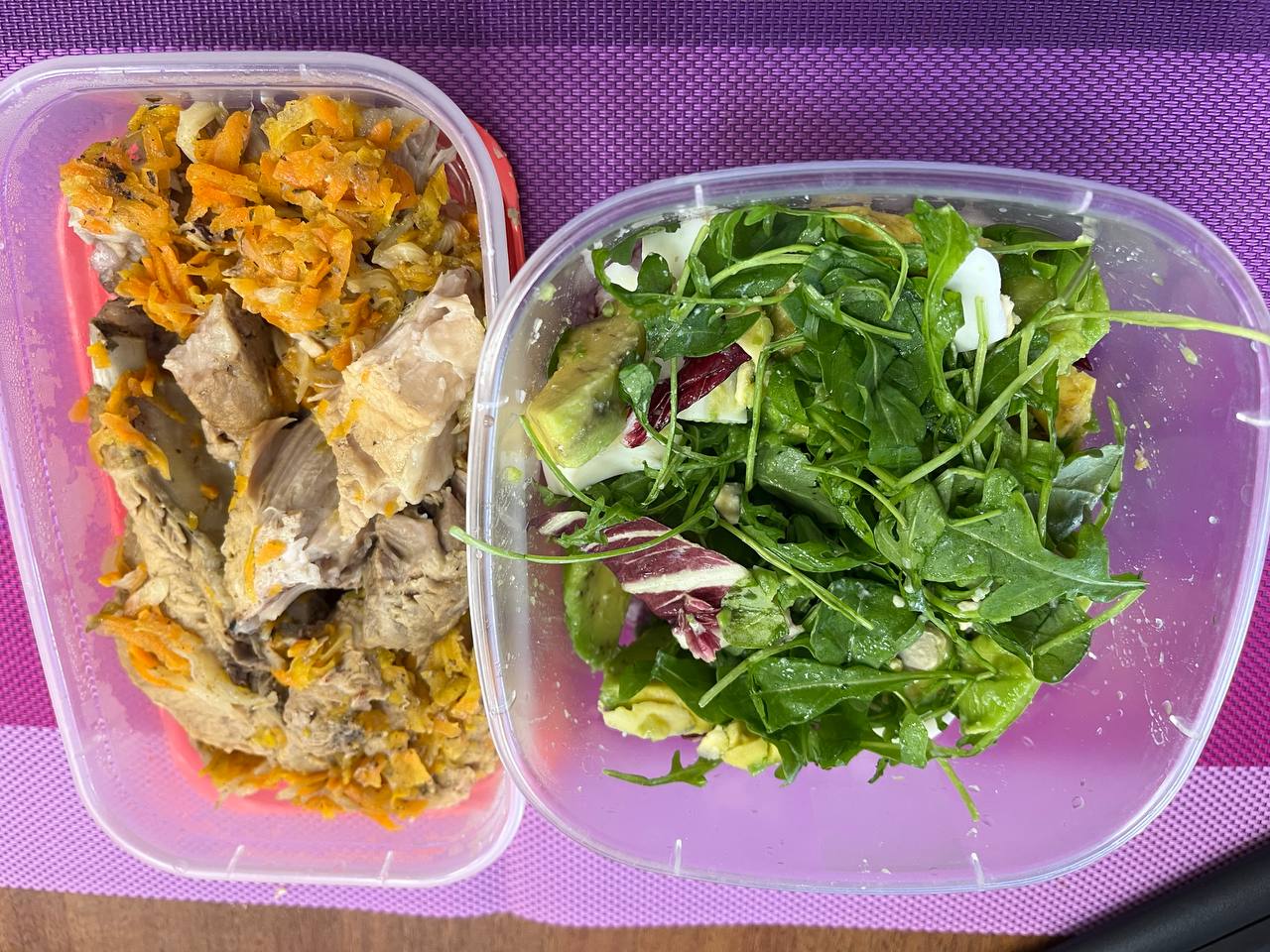 Здравствуйте. Мой омад : ребра свиные, тушеные с луком и морковью, салат : зелень , яйцо и авокадо и за кадром кофе и 2 кусочка пармезана