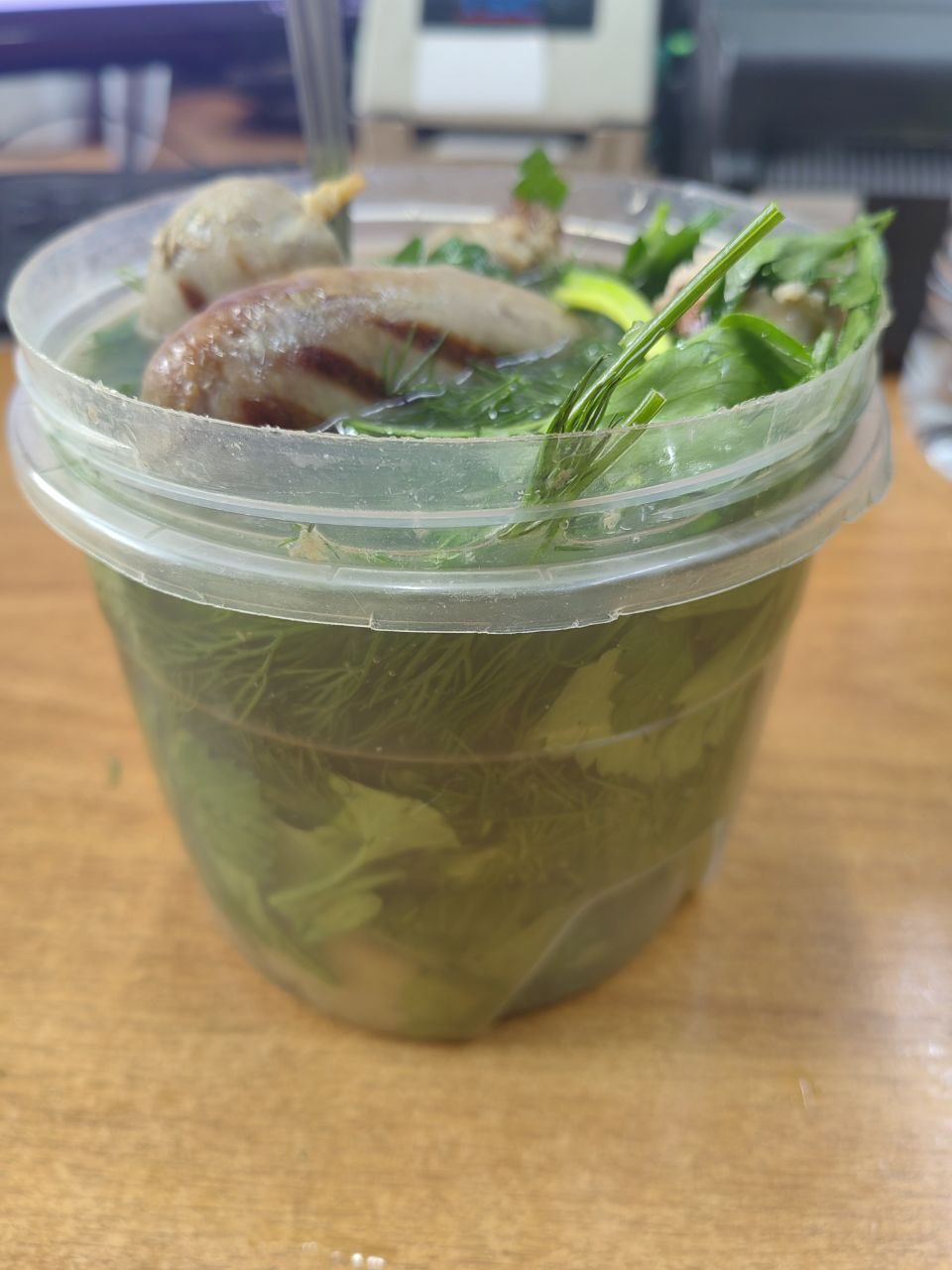 Кушала один раз. Так объелась, что сегодня больше не буду. Бульон на свинине грудинке, зелень 80 гр и колбаски домашние из свинины лопатки + сало + лук. Вечером буду пить только воду Ессентуки и обычную.