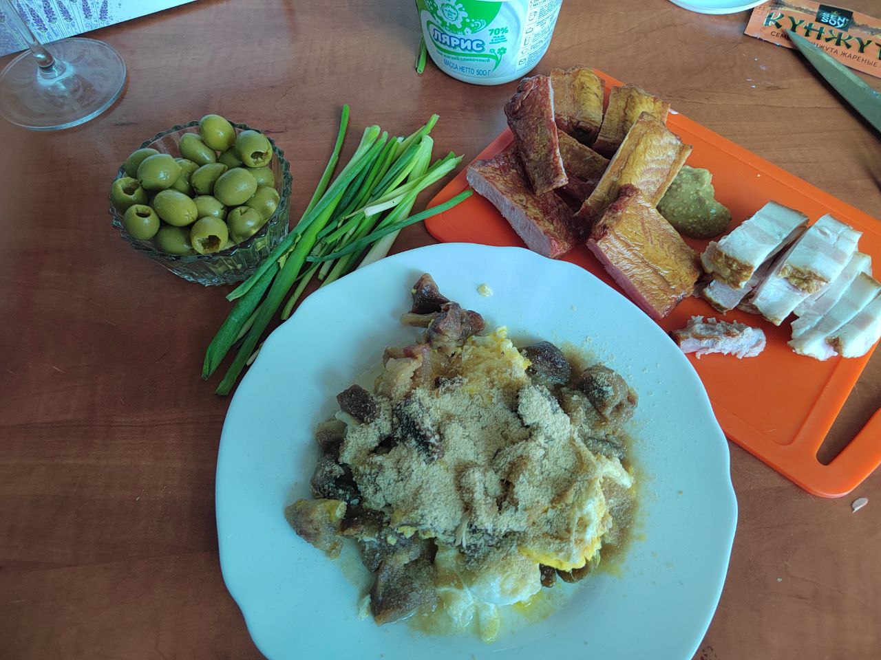Выжарки, дрожи. Ребрышки копченые, салолук яишница из двух яиц.