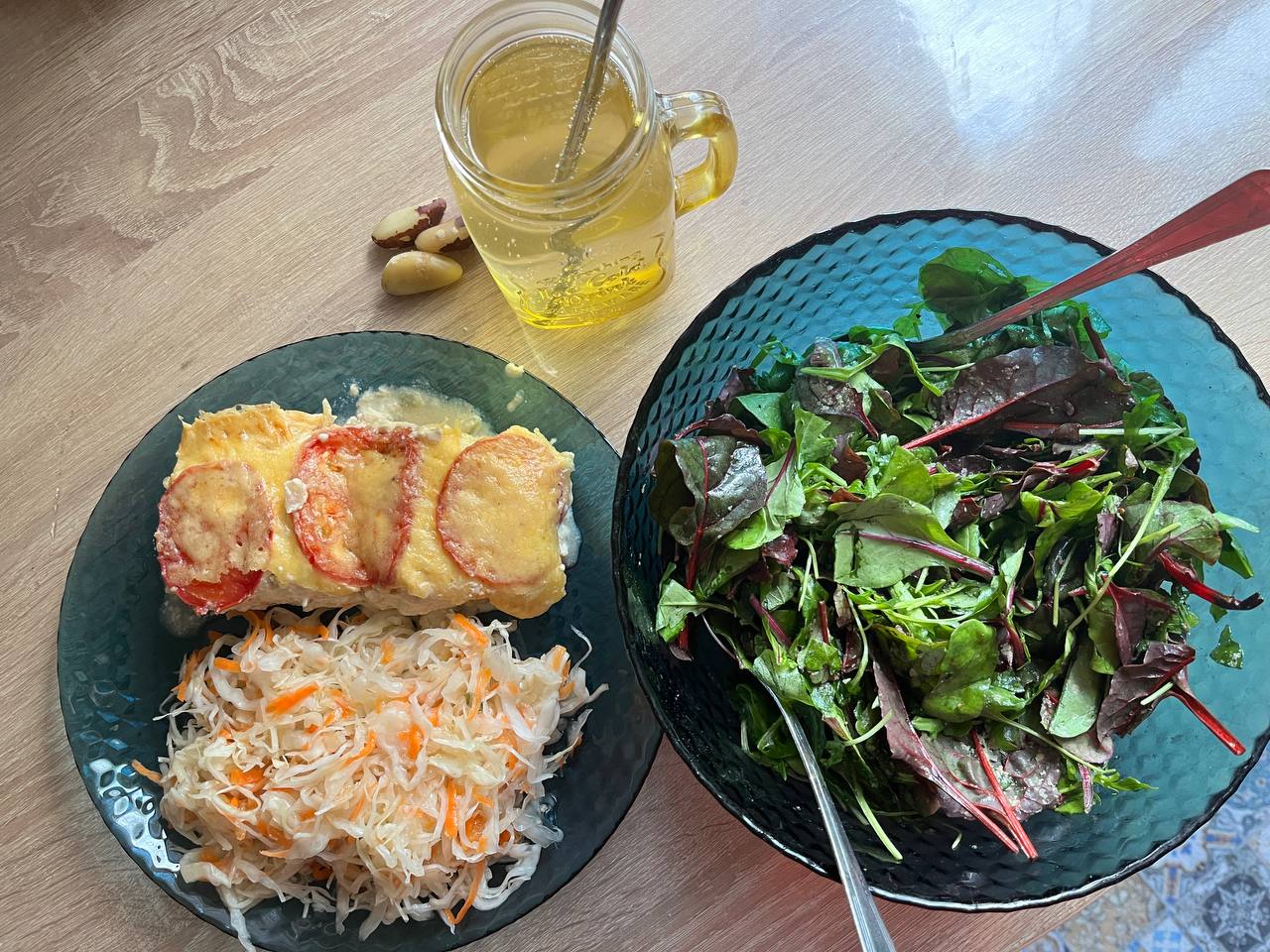 Мой Омад: домашняя квашеная капуста, запеканка из минтая по рецепты Ольги (отвал башки), 180гр салата мекслам с дрожжами, ом и яу. Три орешка и кетопросекко.