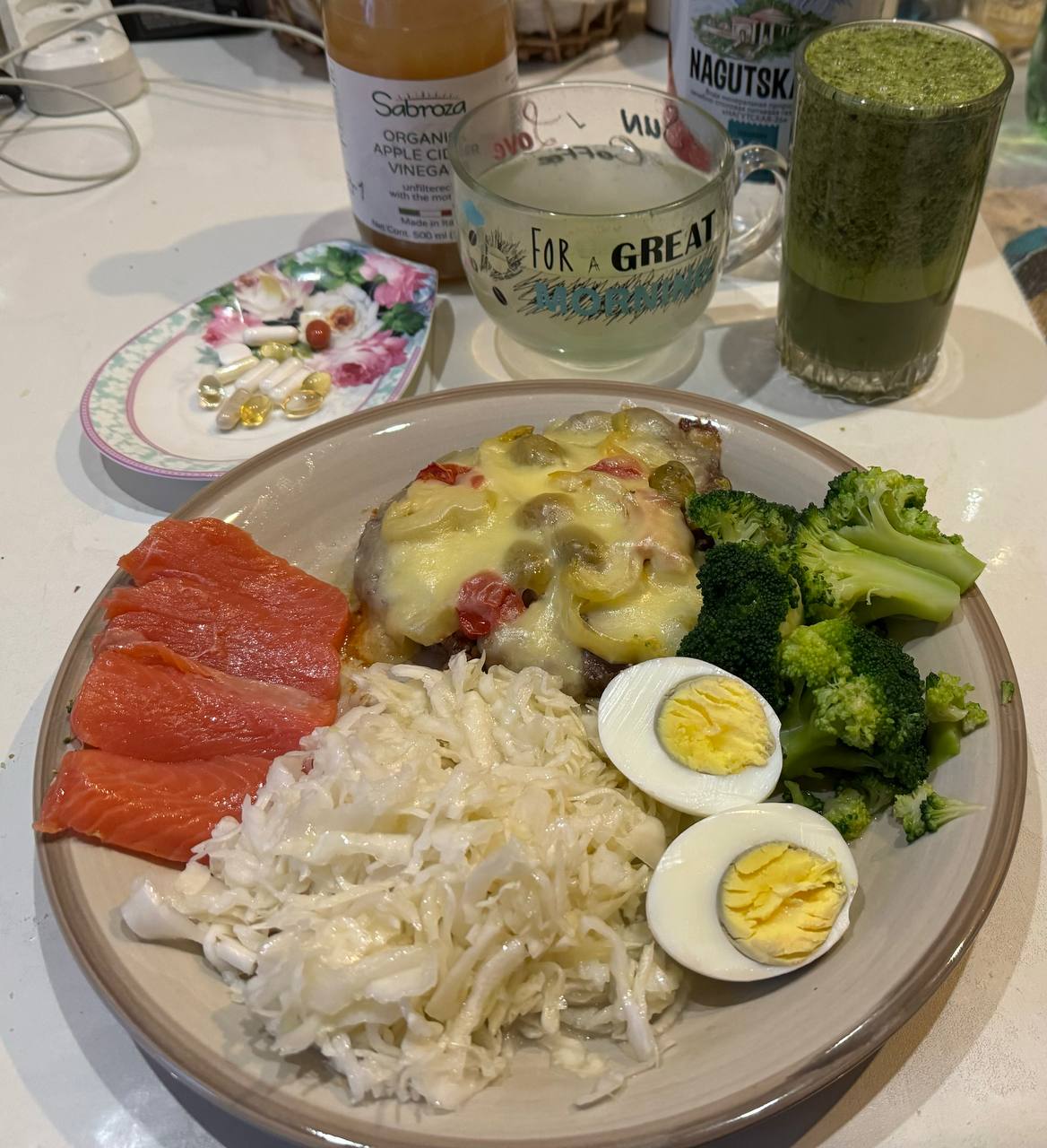 Мой омад ) открылась кусочком сыра с маслом , через 30 минут обэээээд) пицца - основа ( говядина, бедро индейки), болгарский перец , лук репчатый, оливки, черри, моцарелла ), броколли , квашеная капуста , с/с семга) и типа смузи из зеленухи , воды, соли и оливкового масла ) ЯУ с минералкой ) витамины )