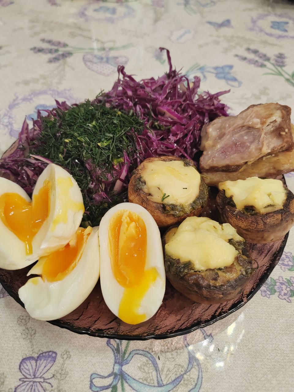 Добрый вечер. Шампиньоны со шпинатом и маскарпоне, два яйца, отварная свиная грудинка, капуста с укропом и семенами льна и тыквы, какао со сливками.