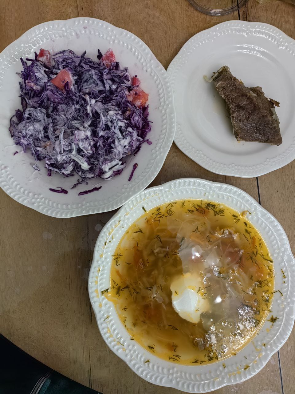 Добрый день! Утро началось поздно (младший ребёнок ночь температурил). Обед 13.30: щи на костном бульоне со сметаной 30% (картофель весь откинула), салат- красноеачанная капуста, помидор, кусок мяса отварного, получилось только половину съесть, какао со сливками 33 и сахзам.