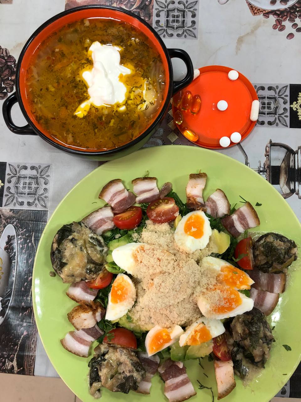 Зелень-укроп, руккола, кинза, авокадо, 2 яйца, грибочки фаршированные, 2ст.л. дрожжей, ну и сало! Бады во время еды. После еды Аллохол и яу мин вода Ессентуки 4