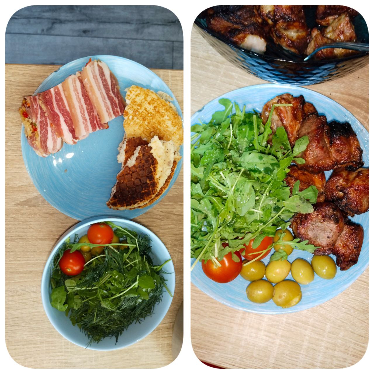 На завтрак : Кето вафли, грудинка , салат с руколой помидоркой, на оливковом масле Кофе со сливками 33% Ужин: Шашлык из шеи (маринад уксус) Оливки, черри, рукола, масло оливковое