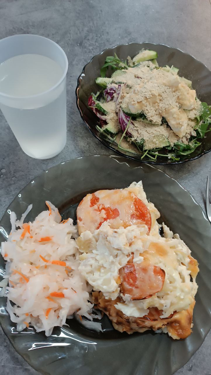 Обед : запеканка рыбная , квашеная капуста, салат с огурцом, рукколой, мангольдом и ещё какими-то листиками)), дрожжи,после еды ещё стаканчик ЯУ