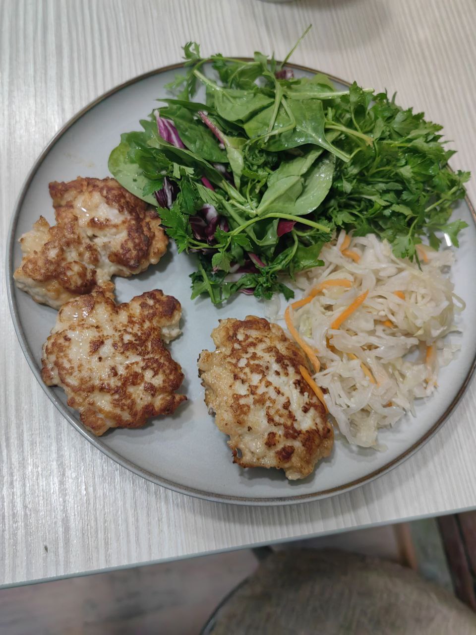 Котлеты жареные на оливковом масле, (кур бедро, свиной жир, яйцо и рикотта), зелень всякая разная, кваш капуста ВВ (без сахара)