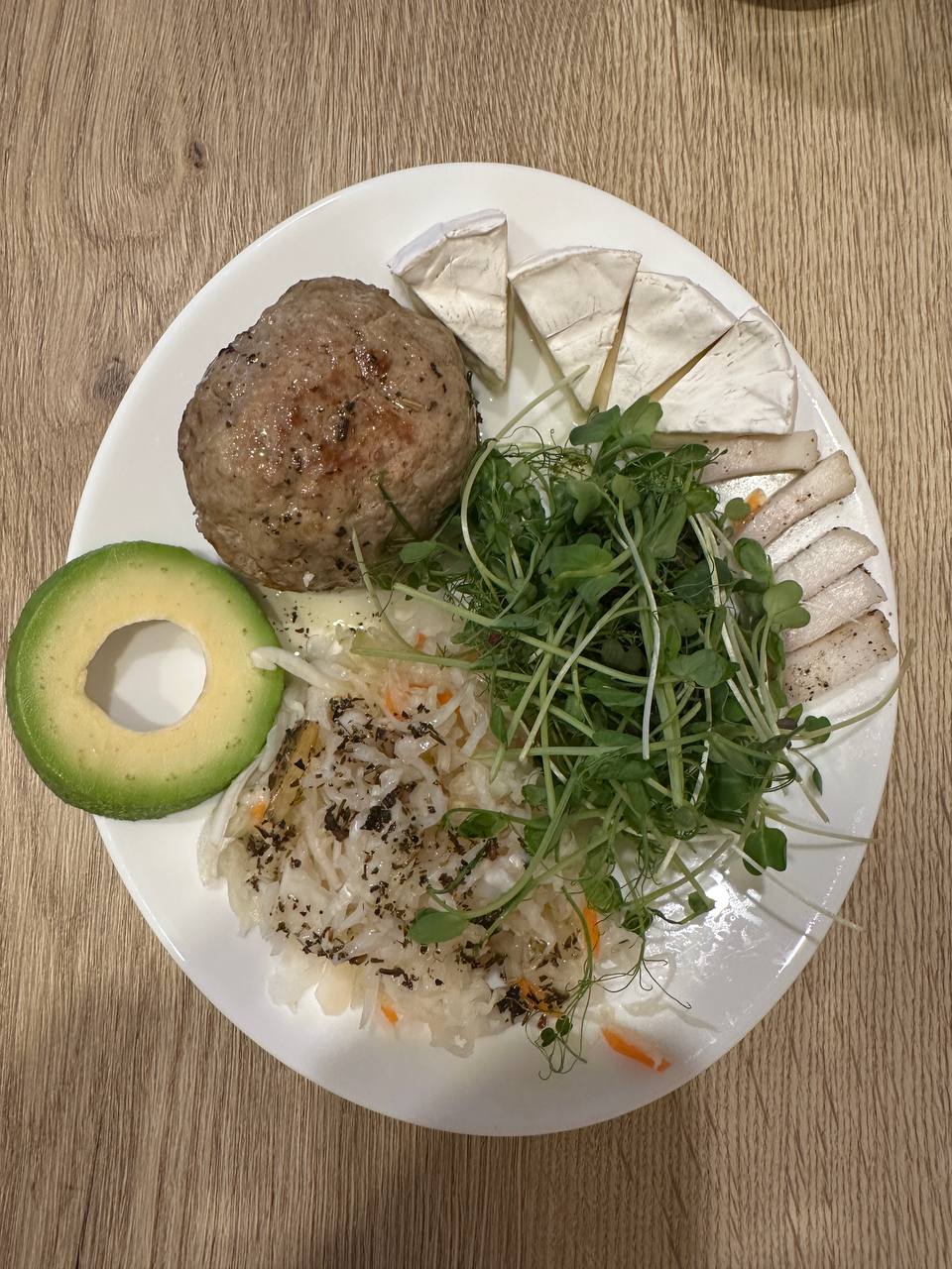 Омад:котлета домашняя (свинина, говядина, лук) на топленом масле, микро зелень (смесь) сало, сыр с плесенью, капуста квашеная с олив маслом, авокадо.