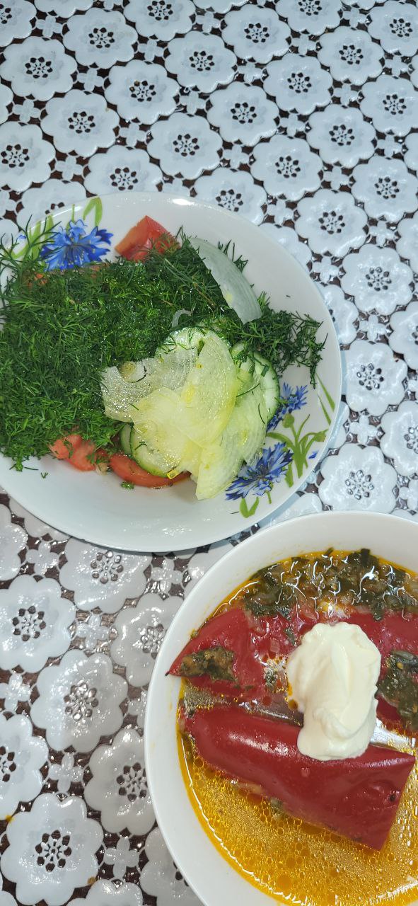 Перец фаршированный, ложка сметаны, салат огурец помидор