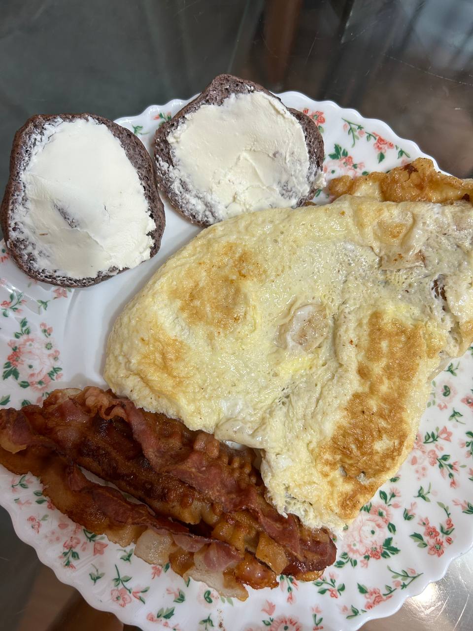 Завтрак: омлет из 3х яиц, бекон, кето-булочка с творожным сыром. Салат: руккола, огурец, ом, дрожжи