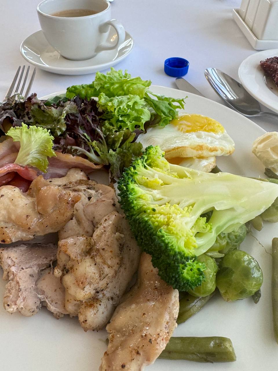 Добрый вечер . Омад . Бедро куриное , 2 яйца зелень бекон гарнир капуста и фасоль гр 10 масла . Бедро без кожи было решила чуть маслица добавить . Открыла ласт в 11 до этого 36 часов голода в дороге . Так и планирую дальше только завтракать . Хотя обычно только ужинаю . Но на 2-3 дня попробую перестроится . Добавки +