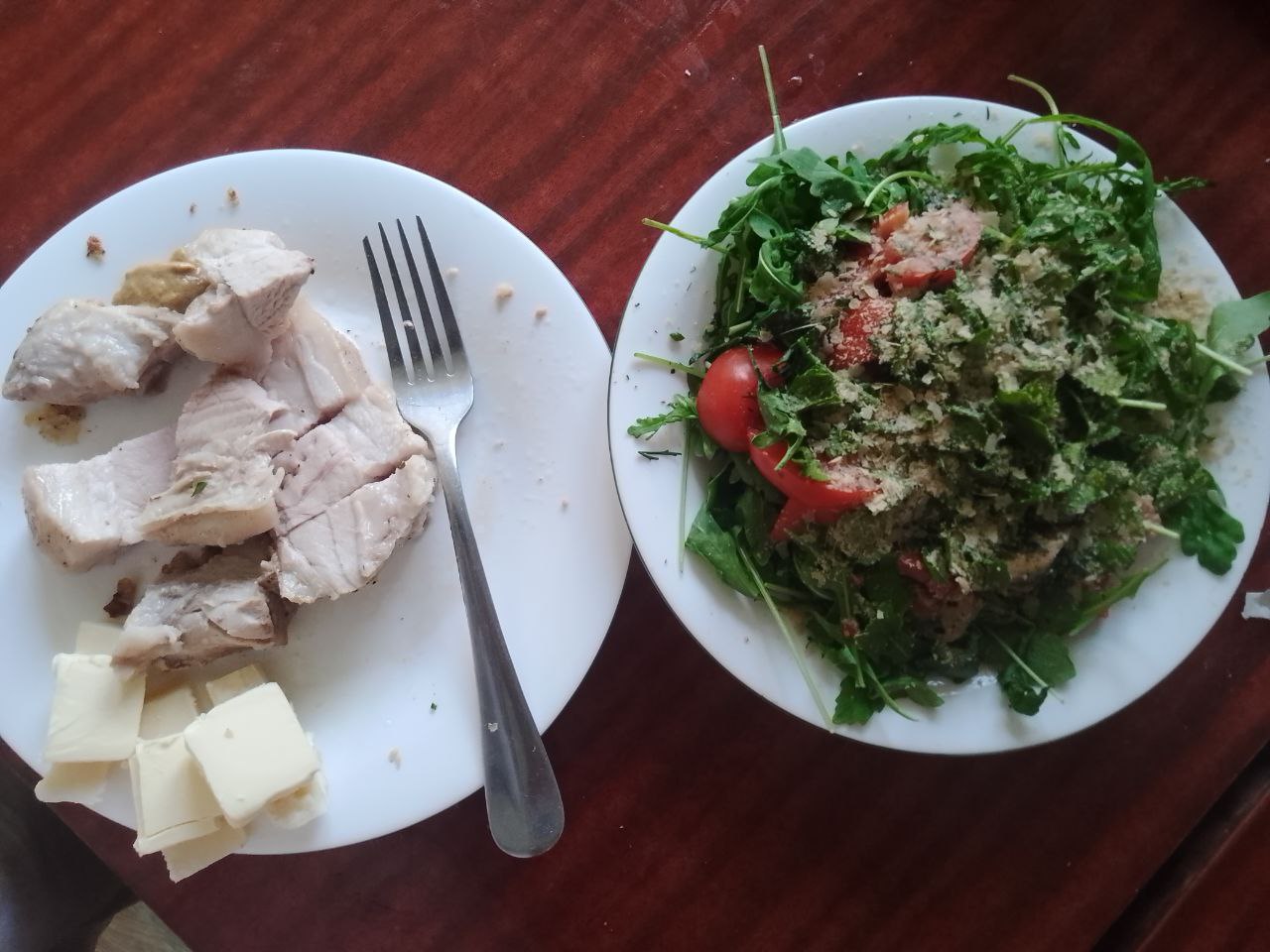 Утром шрот, витамины, черный кофе. В 14 часов обед. Запечённый окорок, пармезан, масло, руккола, помидорка, сельдерей, петрушка, укроп, дрожжи. Черный кофе. Цитрат калия. В течении дня яу с минеральной водой. Вечером будет чай с ромашкой и магний