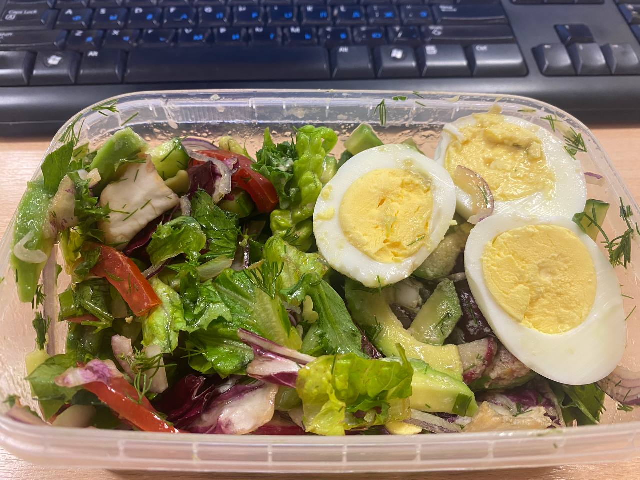 13.00 смесь салата+огурец+авокадо+редис+помидор+красный лук и зелень заправлено оливковым и 2 ложки дрожжей