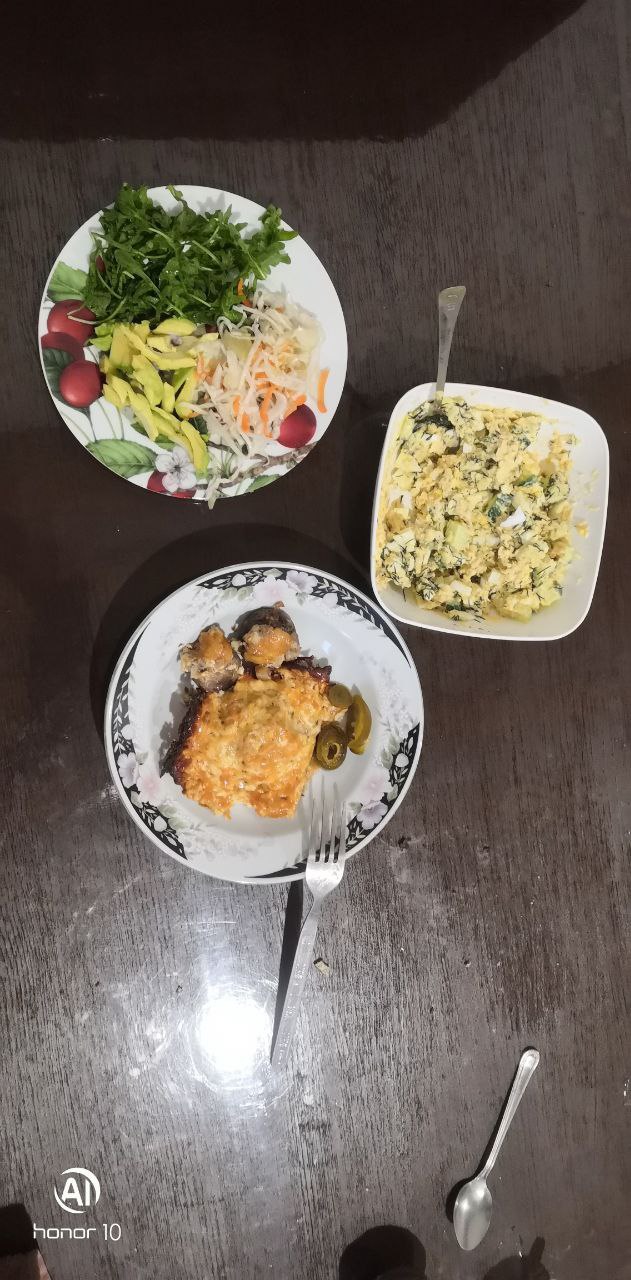 Куриные тефтели по рецепту, плюс два шампиньона. Руккола, квашеная Капуста, половина авокадо.