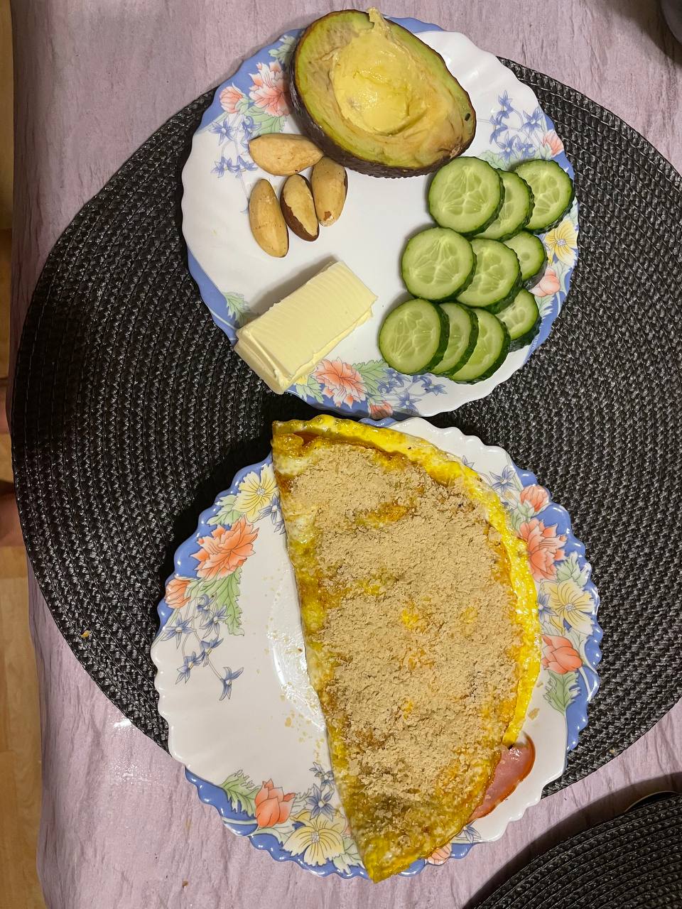 Утро: 2ч.л шрота натощак, после завтрак через 40 мин: 3 яйца жаренные на оливковом, с помидорками черри, беконом, моцареллой+посыпано дрожжами. Сыр+масло, половинка авокадо, огурец, бразильские орешки (очень люблю их и купили их 2 кг, поэтому развлекаюсь с ними)+кофе зерновой. Это было в 5:30-6 утра. Обед (ужин)в 16:00: запеканка из куриного филе бедра в сливках 35%, с грибами, укропом и моцареллой. Овощей не захотела никаких, поэтому без них. ЯУ не могу пить перед едой, ощущения не приятные, поэтому пью после. Сегодня аппетита нет почти, днем поела т.к совсем очень вяло себя чувствовала. +начались кд, подташнивает чуть.
