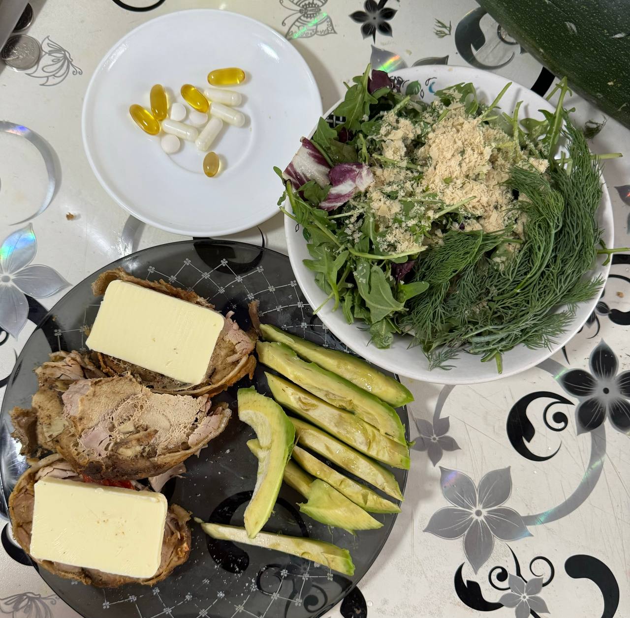 Темная зелень+соль розовая+ оливковое масло+ дрожжи и авокадо