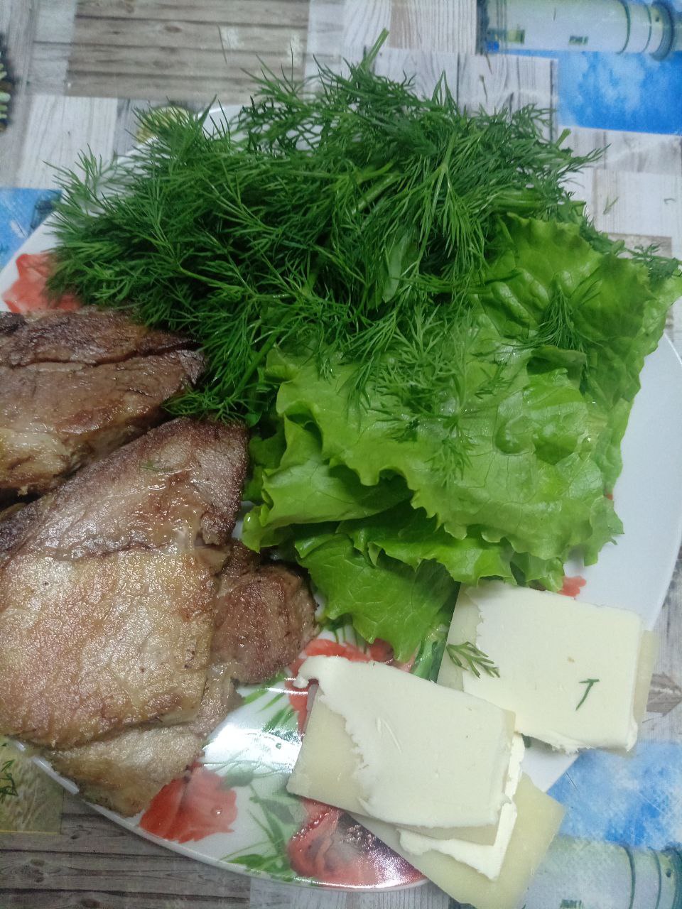 Омад не получился... Но мучиться от голода не стала. Отварная свиная шея, обдаренная на кокосовом масле, масло сыр, укроп и салат. После еды дрожжи и яу
