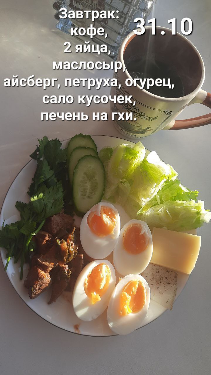 Здравствуйте! Завтрак - на фото с описанием (простите, что так. С насморком голова как шар чугунный🤦🏻♀️) Обед - нет Ужин - скумбрия запеченая, бекон, авокадо, лимон, огурец. (Без фото, т.к. совсем некрасиво🙈)