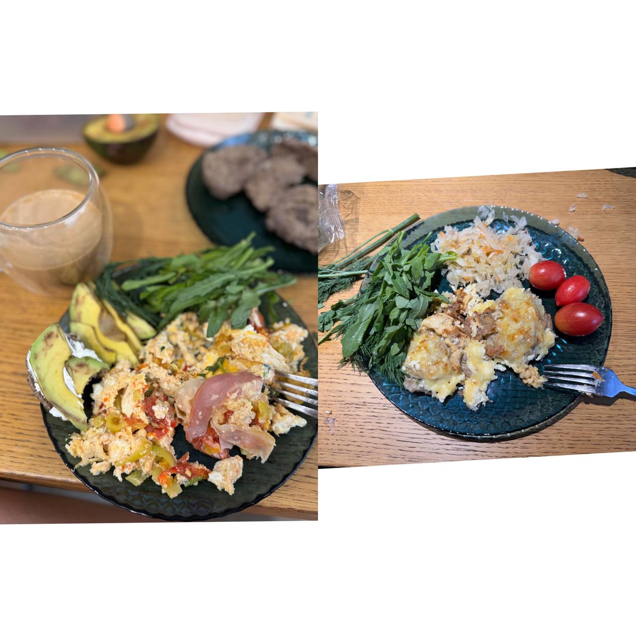 Завтрак: яичница с беконом, томатом, перцем, шпинатом. Кето хлеб с твор сыром и авокадо, зелень разная темная, кофе со сливками