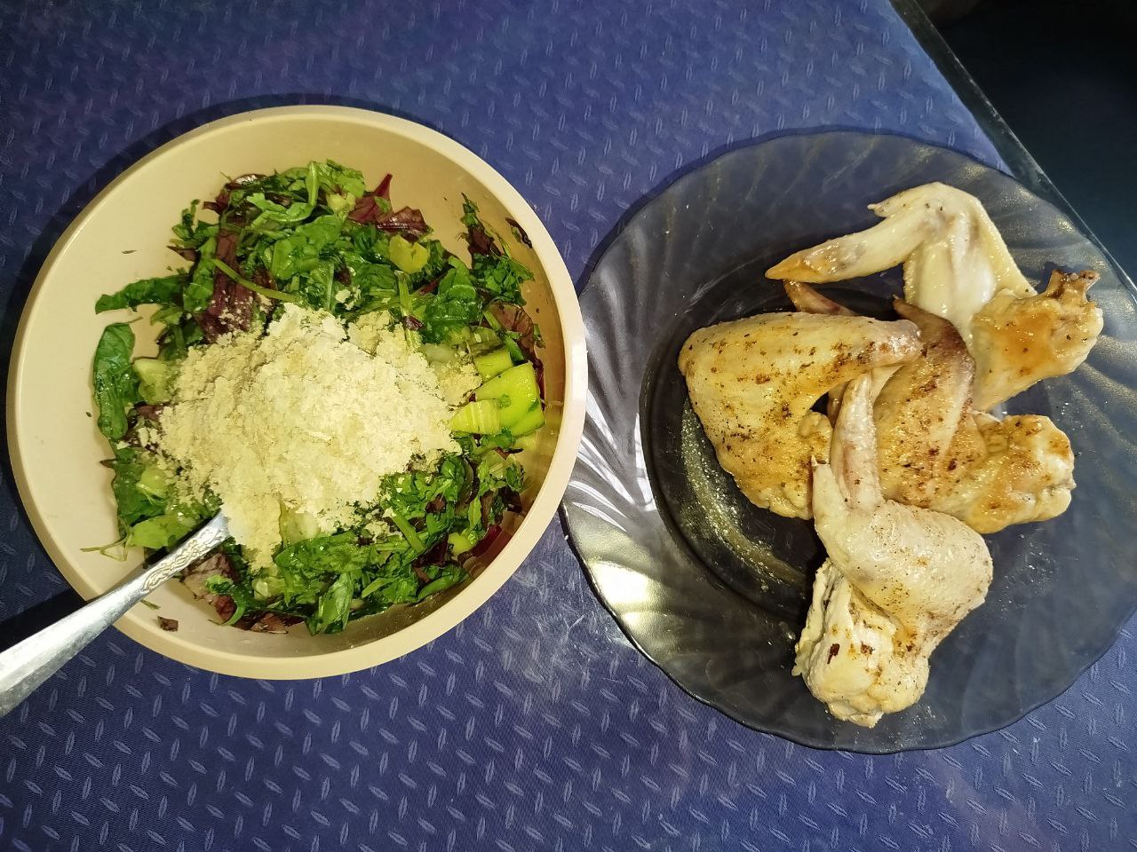 Добрый вечер всём) В 13.00- крылышки куриные по Олиному рецепту, салат из огурца, мангольда, шпината, рукколы и дрожжи В 18.00- блинчики по Олиному рецепту, в начинке :капуста, яйцо, петрушка, укроп; сало и пол авокадо
