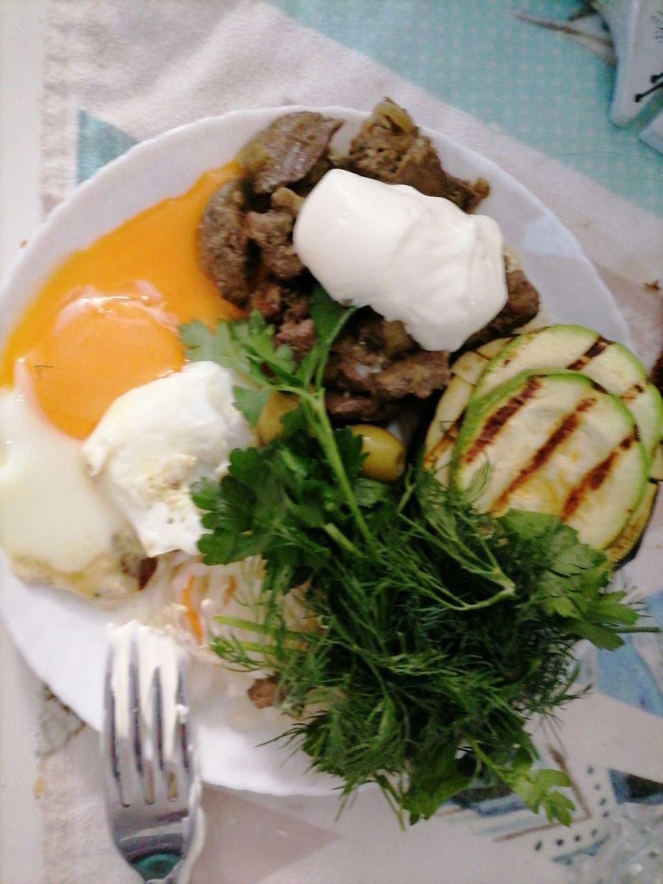 Яйцо+печень с луком+сметана 30+кабачок+баклажан +зелень +оливки+квашенная капуста+чай