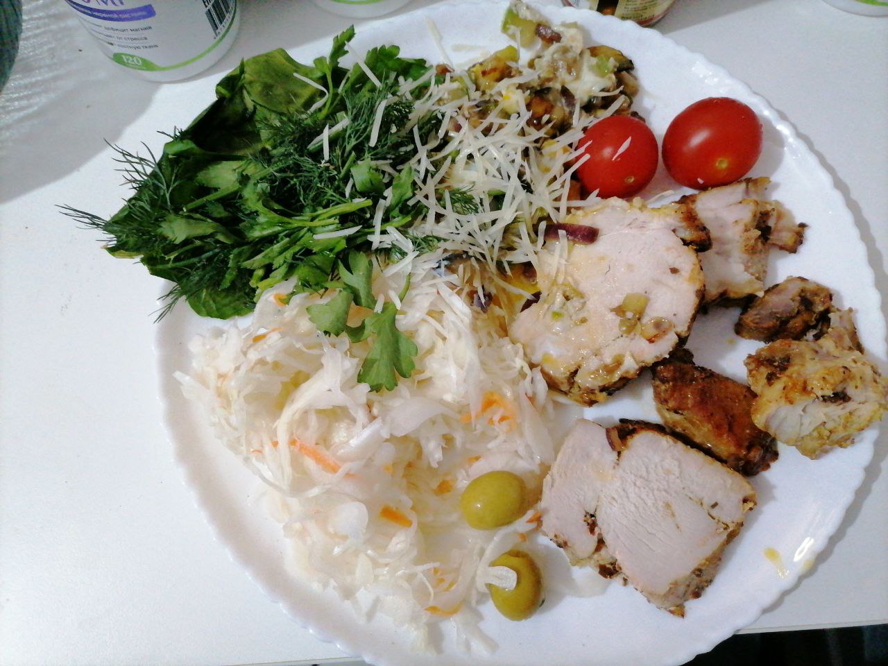 Мясо+квашенная капуста+зелень +яйцо+помидор+оливки+баклажан кабачок лук шампионьон обдаженные