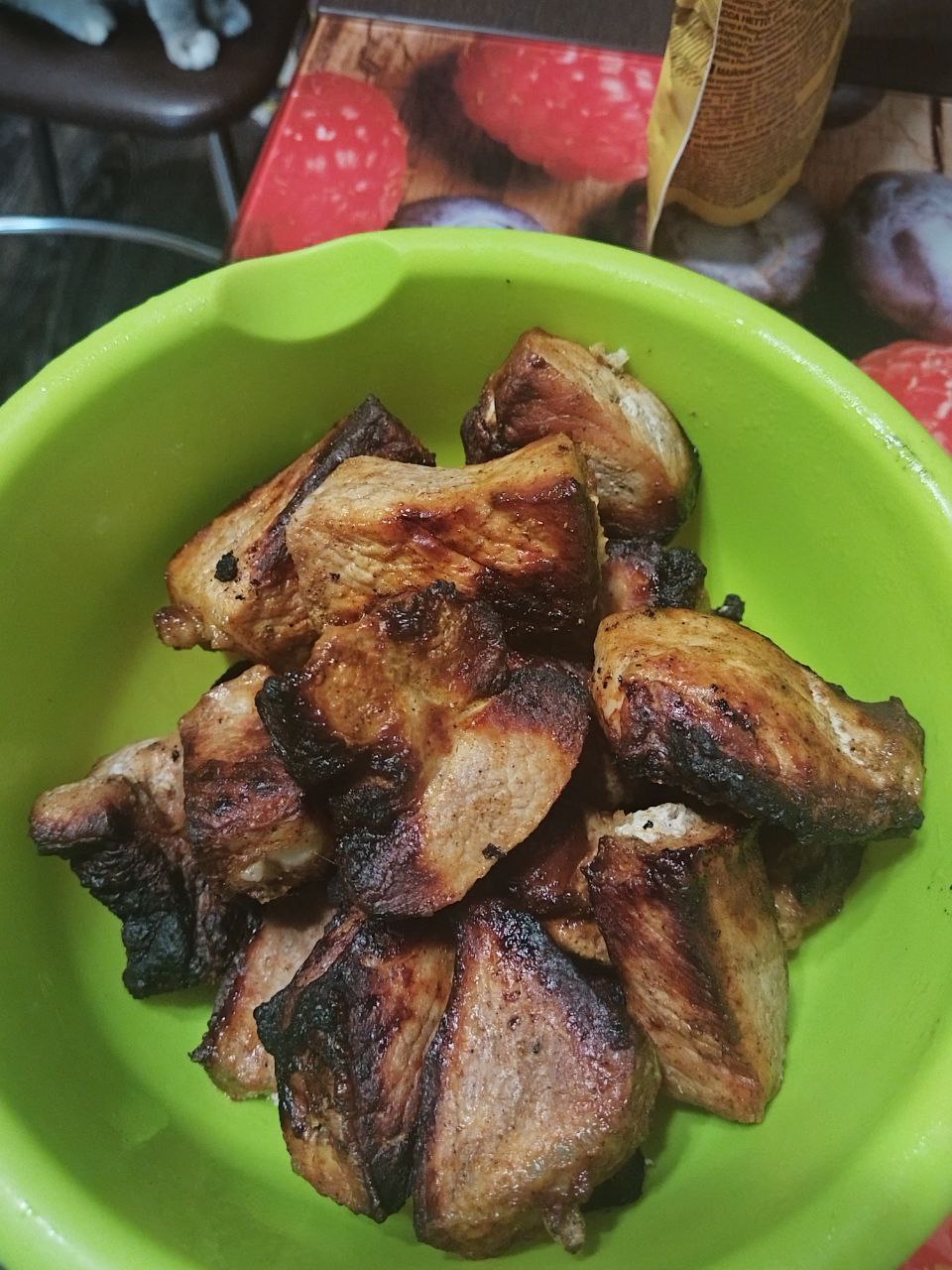 Добрый вечер всем! Сегодня получился омад. Уехали в гости. Из того, что было на столе, выбрала для себя следующее:шашлык свиной, салат из листьев, помидор, огурцов и яиц с оливковым маслом и горчицей. Сыр бри