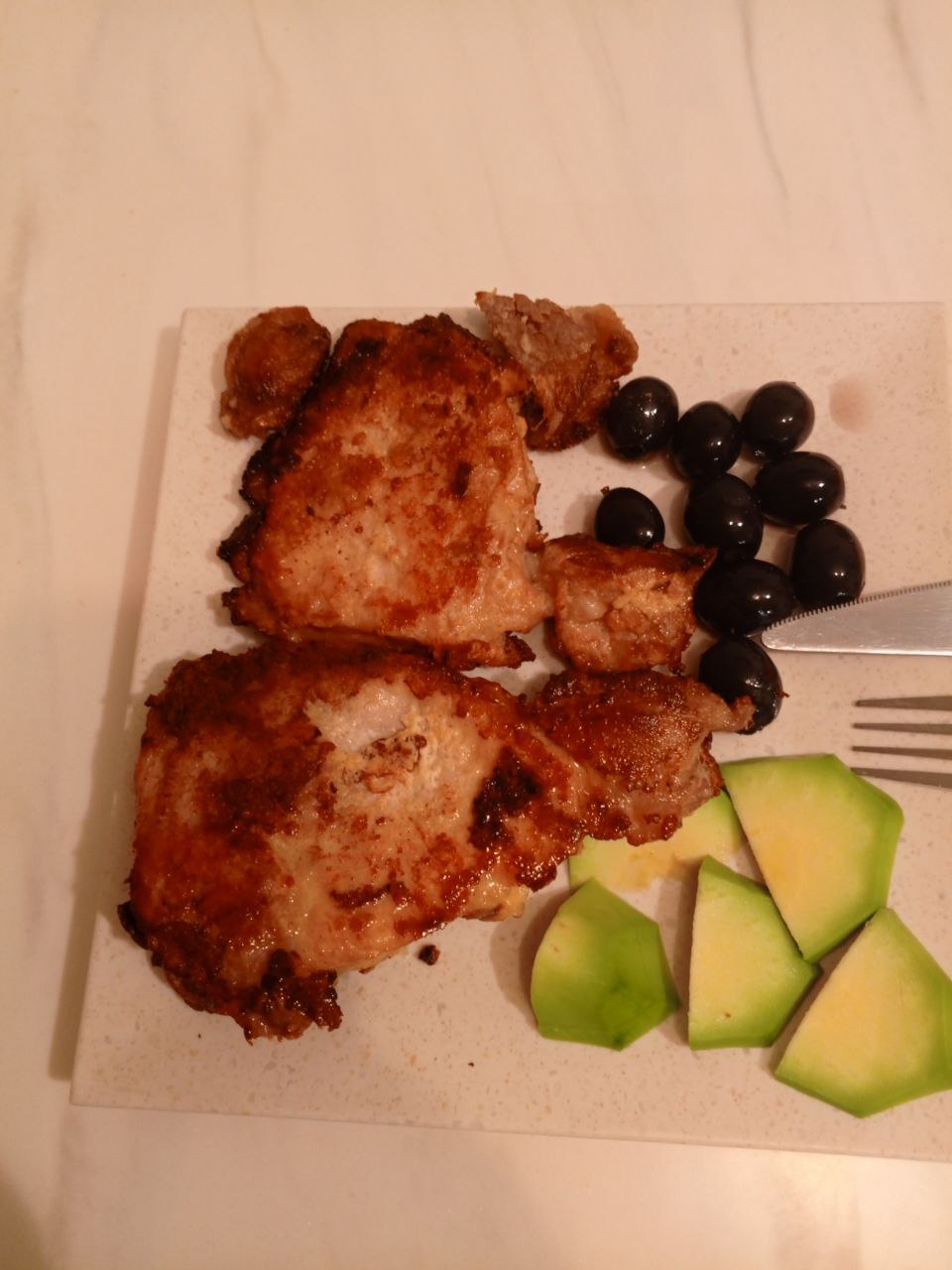 Добрый день. Вчера не отправила, обед и ужин. На обед: жаренное сало с жареным авокадо, 3 яйца, салат свеклолист и руккола, заправлено оливковым маслом. Ужин две свиные отбивные с авокадо и оливками. Кофе 2 раза в день с приемом пищи, черный.