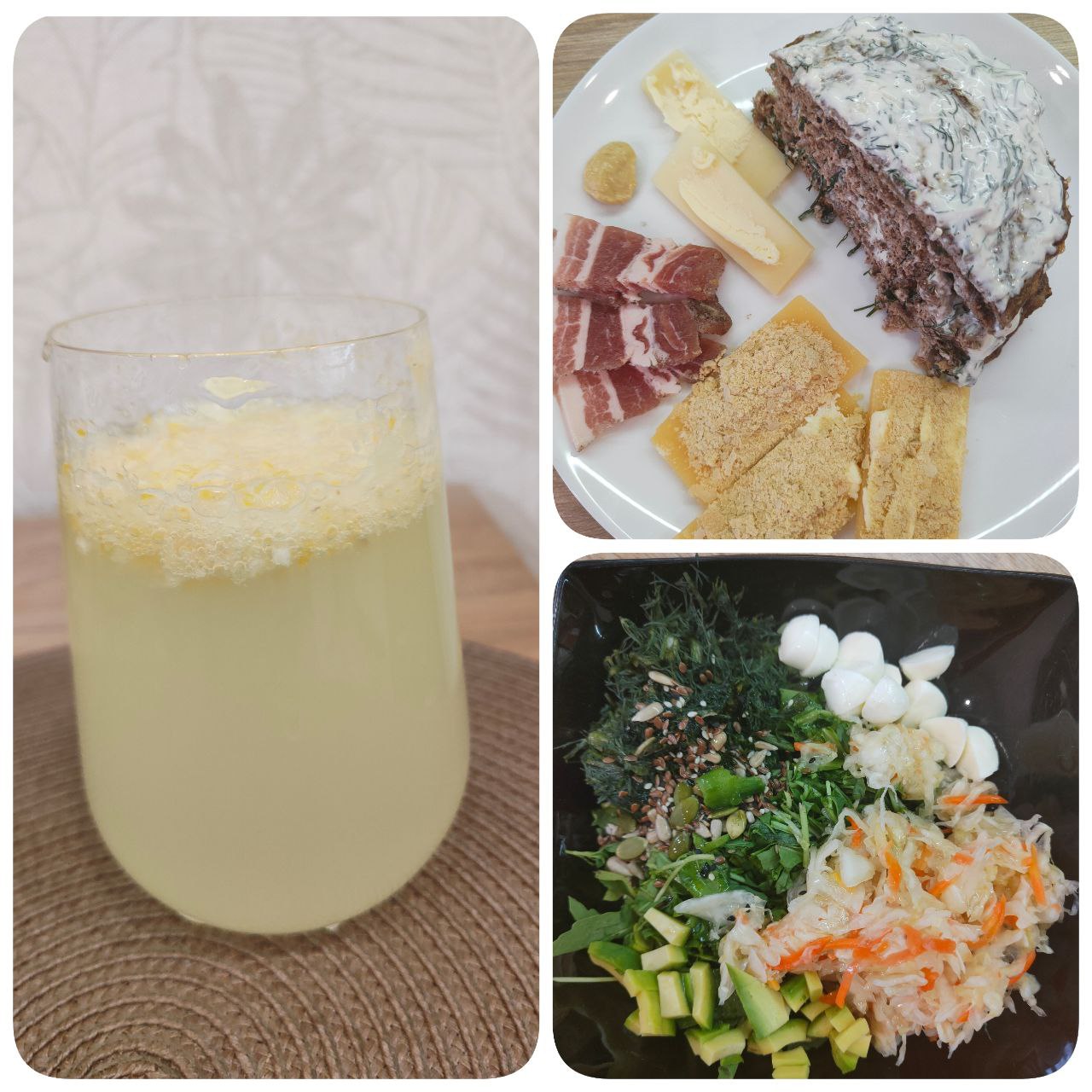 Печёночный торт (без лука и моркови), жарила на кокосовом масле, смазан сметаной 30%+укроп +чеснок. Масло сыр + дрожжи. Грудинка солёная.