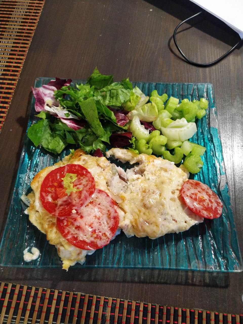 Днём кофе со сливками, в 5 обедоужин: рыбная запеканка, салатные листья, масло оливковое, сельдерей.