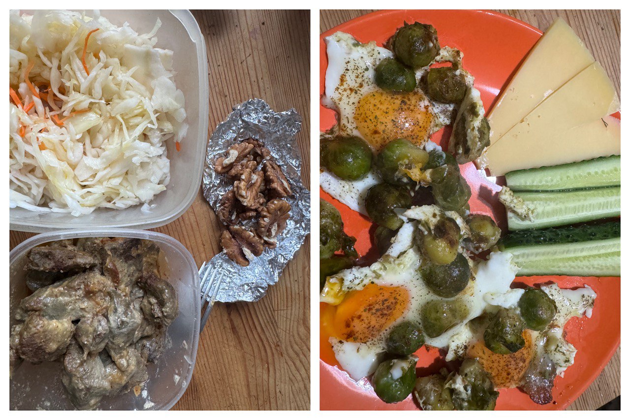 Ужин 3 яйца на сале, капуста брюссельская, сыр пармезан, огурец, зелень не успела купить