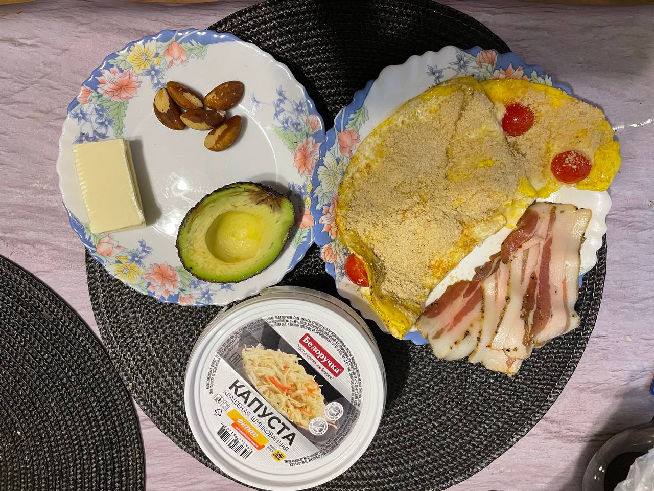 Выспалась, мужа на рыбалку отправила😁 с собачкой погуляла. В песиком час где-то гуляла и нагуляла зверский аппетит. Проснулась, вообще ничего не хотела, кое как запихала в себя расторопшу. В общем, завтрак у меня не изменный(3яйца смешиваю и на оливком жарю, туда черри и моцареллу. Выкладываю всегда не целым блином, а сворачиваю пополам. Там и начинка как раз вся внутри)+дрожжи сверху, авокадо, маслосыр, бразильские орехи, кофе зерновой. Только в этот раз взяла сало и очень захотелось капусты квашенной. Добавки из КЗ, увеличила дозу Вит.д , омеги,д3+к2. И цитрата калия выпила не 4, а 5 шт. По ощущениям, почувствовала что как-то не хватает. Вчера вечером поплохело( скорее из-за КД), закинулась маслосыром. ЯУ с минералкой не помогал🙁