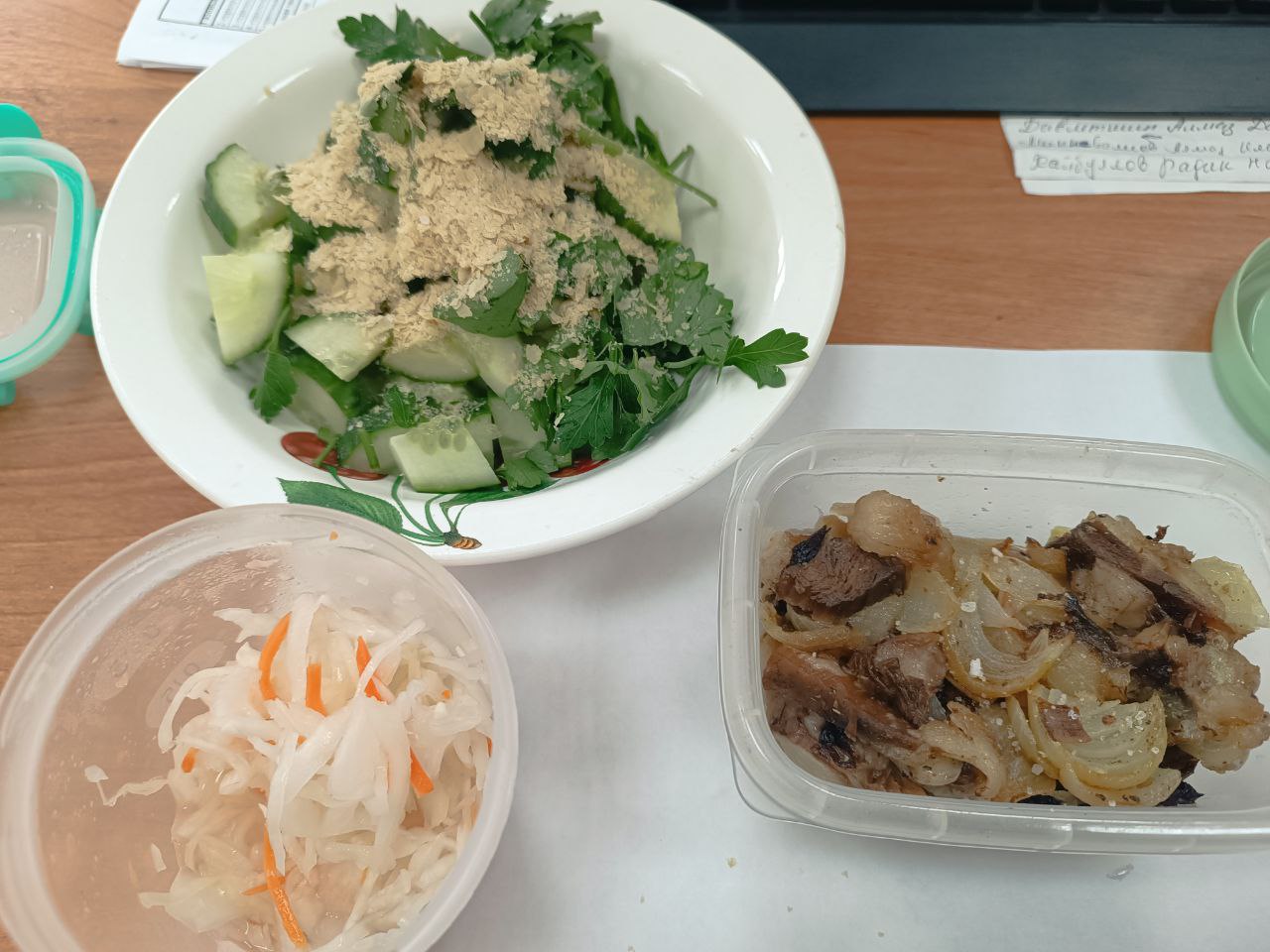 Завтрак- кофе+сливка Обед-квашня,салат из огурцов+петрушка.(Заправки нет,торопилась и забыла). Рёбрышки говяжьи с жиром и луком. Витамины Утром до обеда минералку
