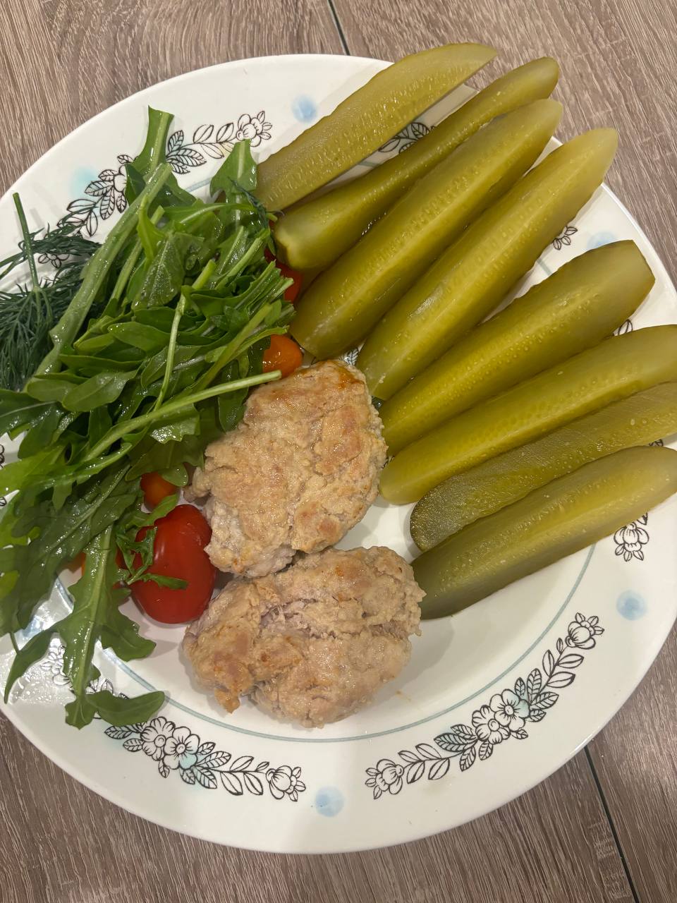 Мой прием пищи: -котлеты из свино-говяжьего фарша с добавлением пищевых дрожжей на сливочном масле -огурцы бочковые -черри -укроп -руккола