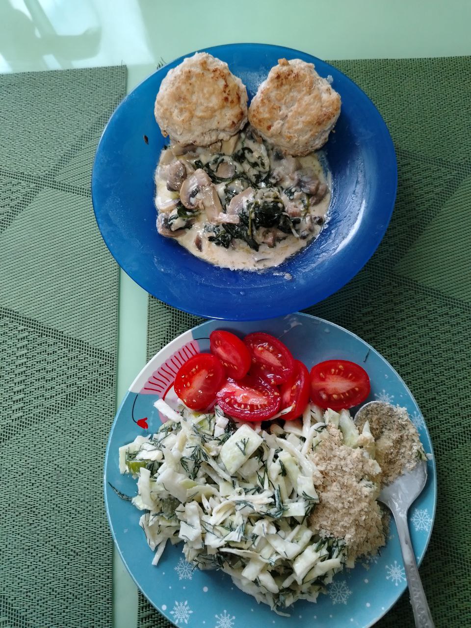 Доедаю тефтели куриные и грибы тушеные, в сливках со шпинатом, салат тож доедаю вчерашний, дрожжи на салате, два раза кофе со сливочным маслом и один раз с сливками домашними,