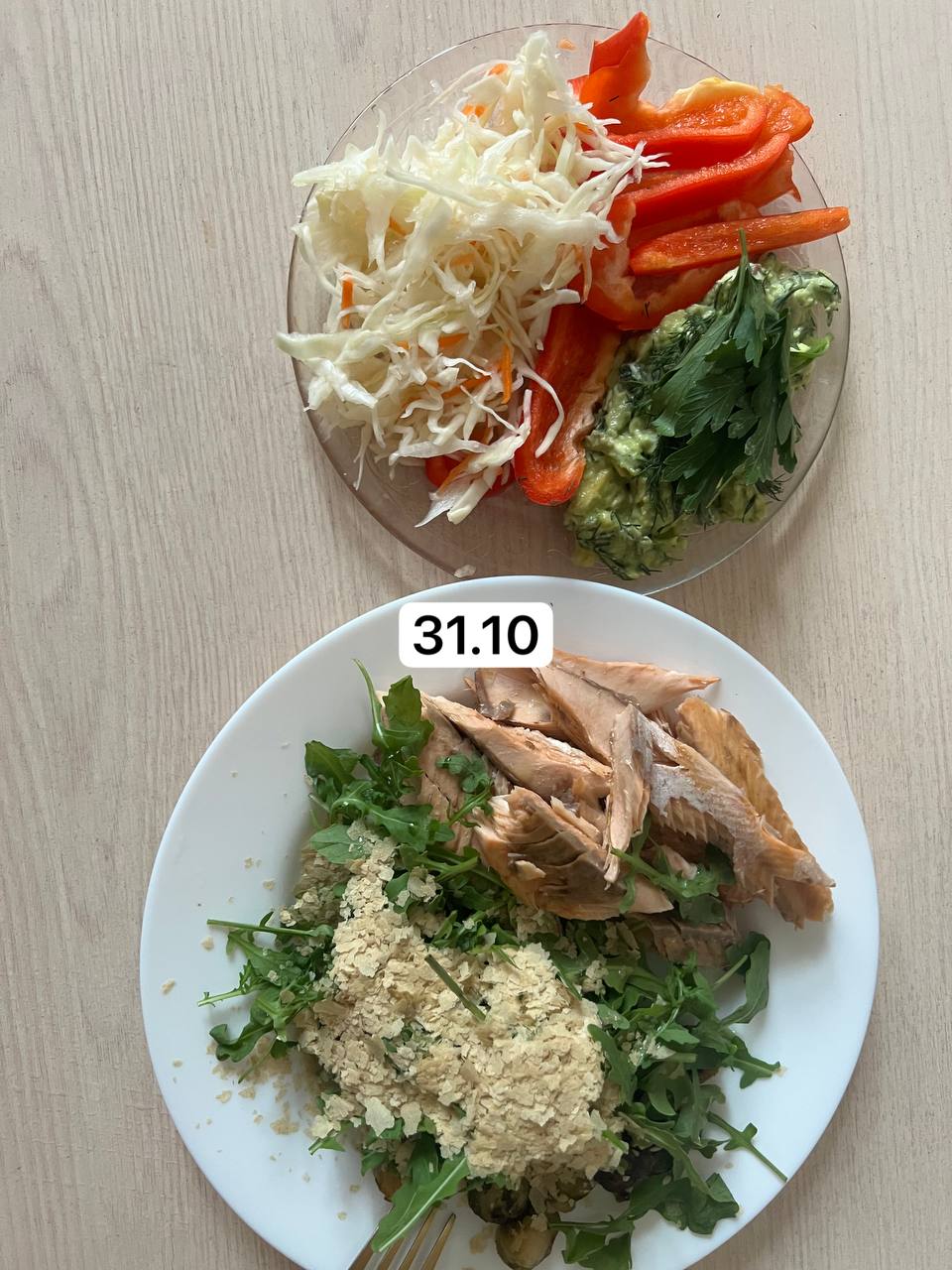 Горбуша запеченная в масле с брюссельской капустой, руккола, дрожжи. Капуста квашеная, болг.перец, зелень с авокадо, творожным сыром и маслом. Пока ела, горбушу часть оставила, но будто не хватило Жиров, закусила еще салом и сыром сулугуни. На десерт кокосовые чипсы чистые.