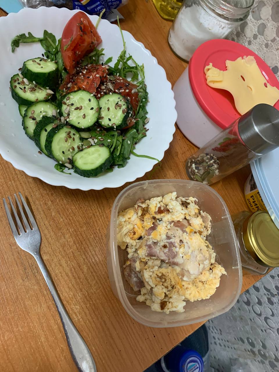 Обед. Омлет из 3 яиц с беконом. 3 куска сыра Маасдам, салат с 2 ложками оливкового масла. На десерт будет рикотта с клубникой